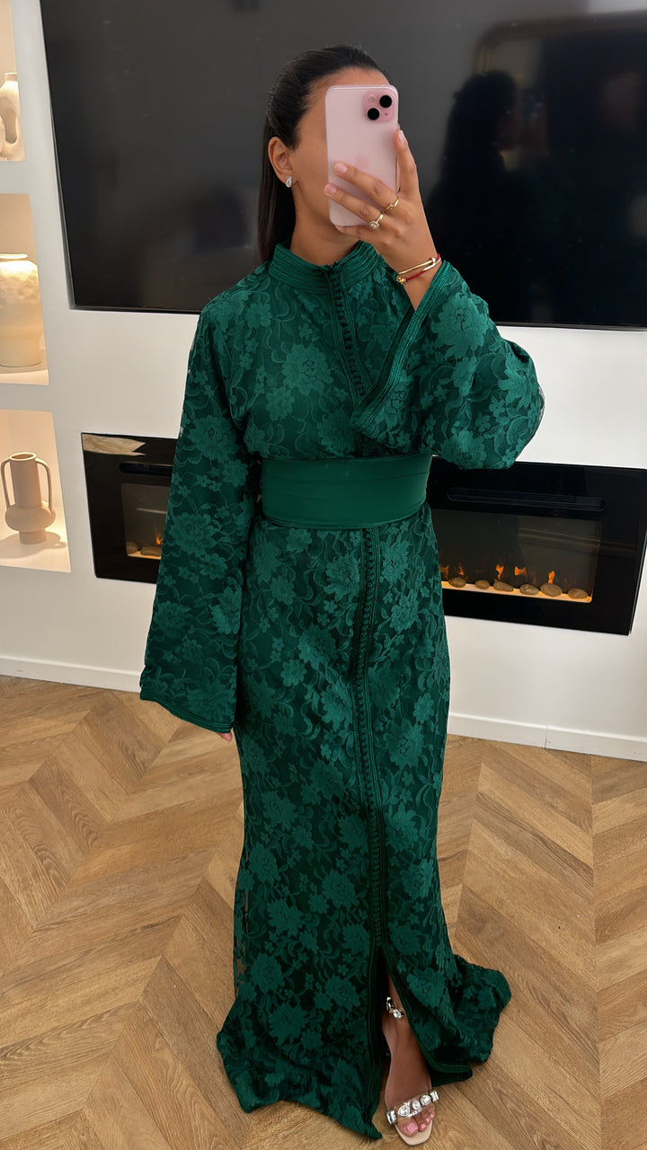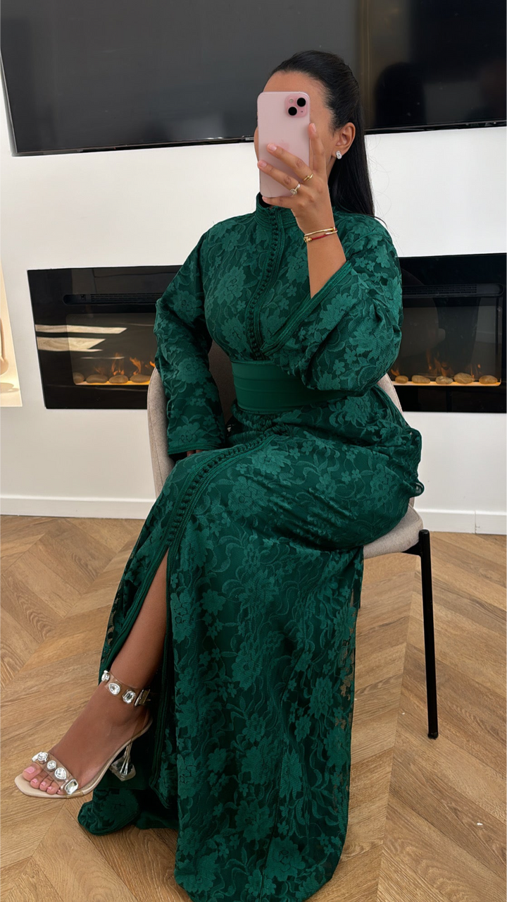 Caftan long coupe sirène, élégant et raffiné. Col avec zip pouvant s’ouvrir et ceinture assortie pour mettre en valeur la silhouette. Taille unique 34-40.